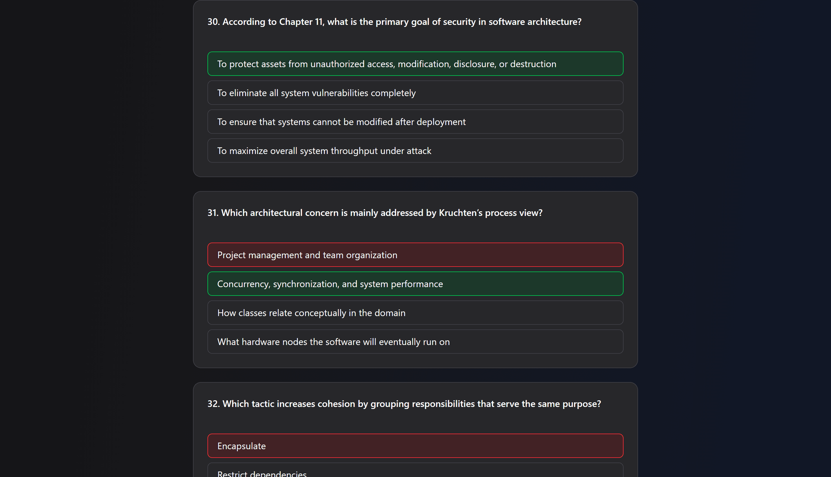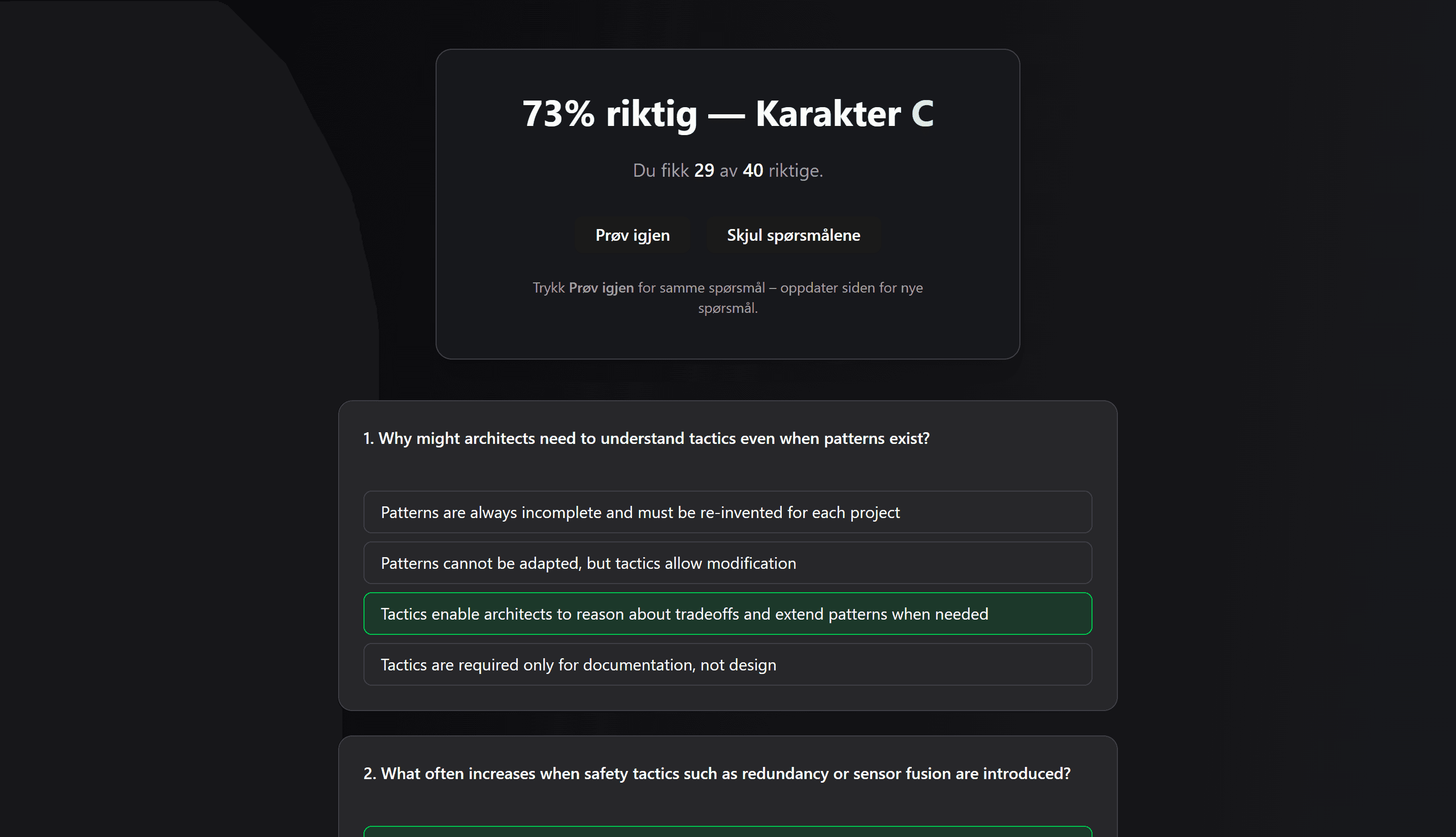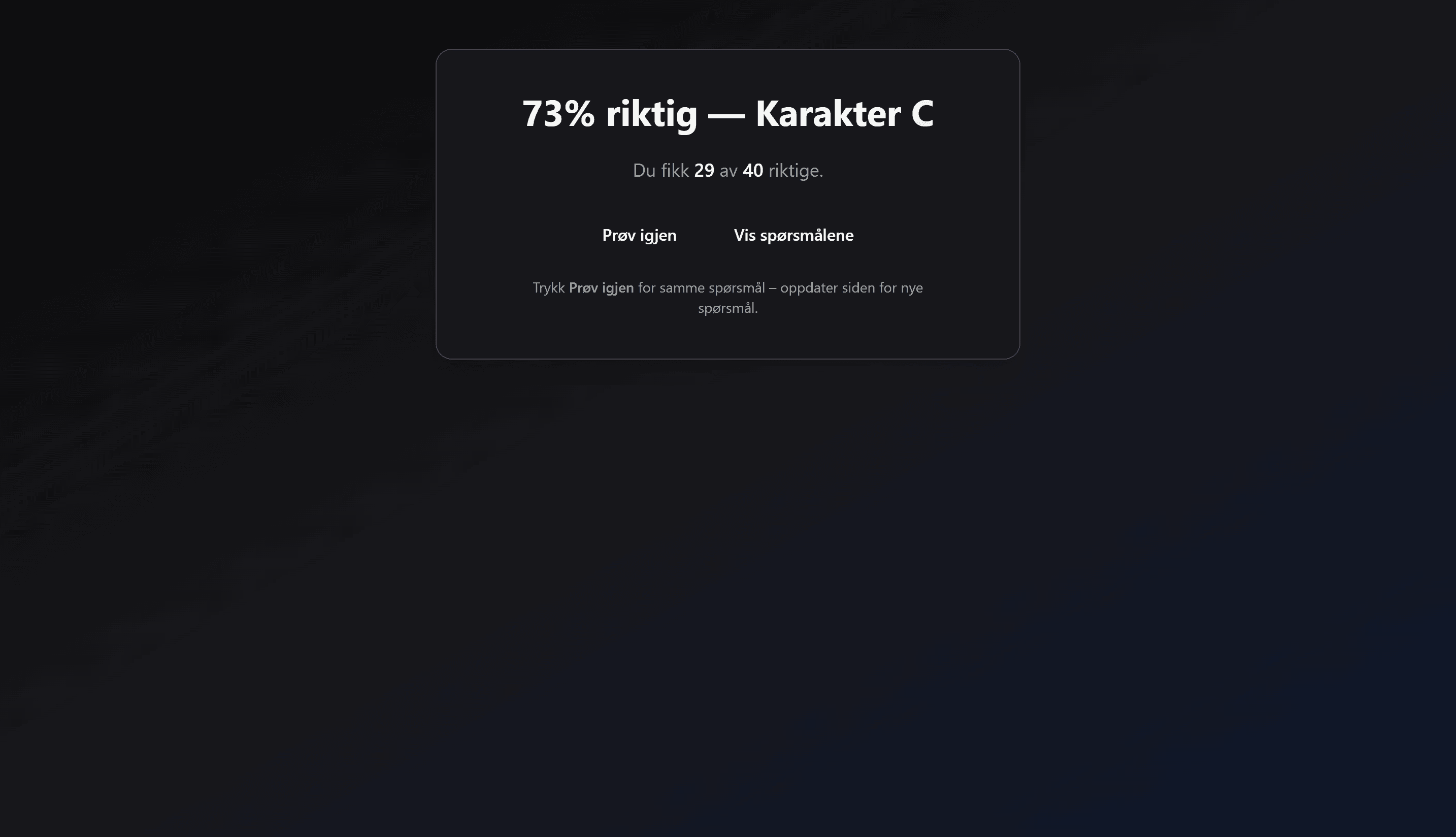 quiz-app laget for å pugge til eksamen. Brukeren kan starte en quiz, få resultat i prosent og karakter, og kan vise fasit med markering av riktige og valgte svar.