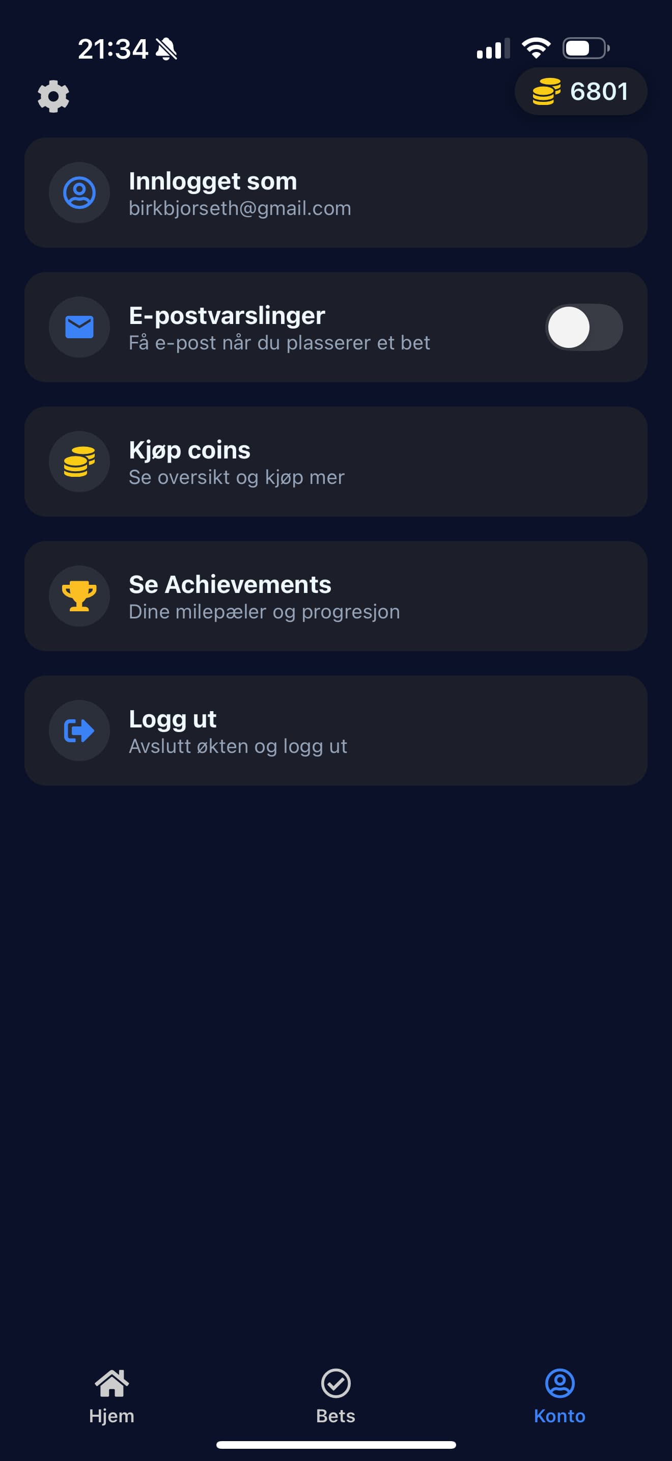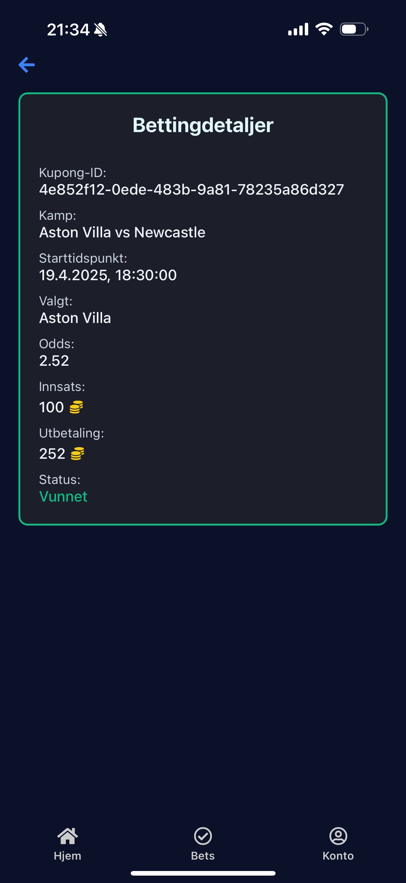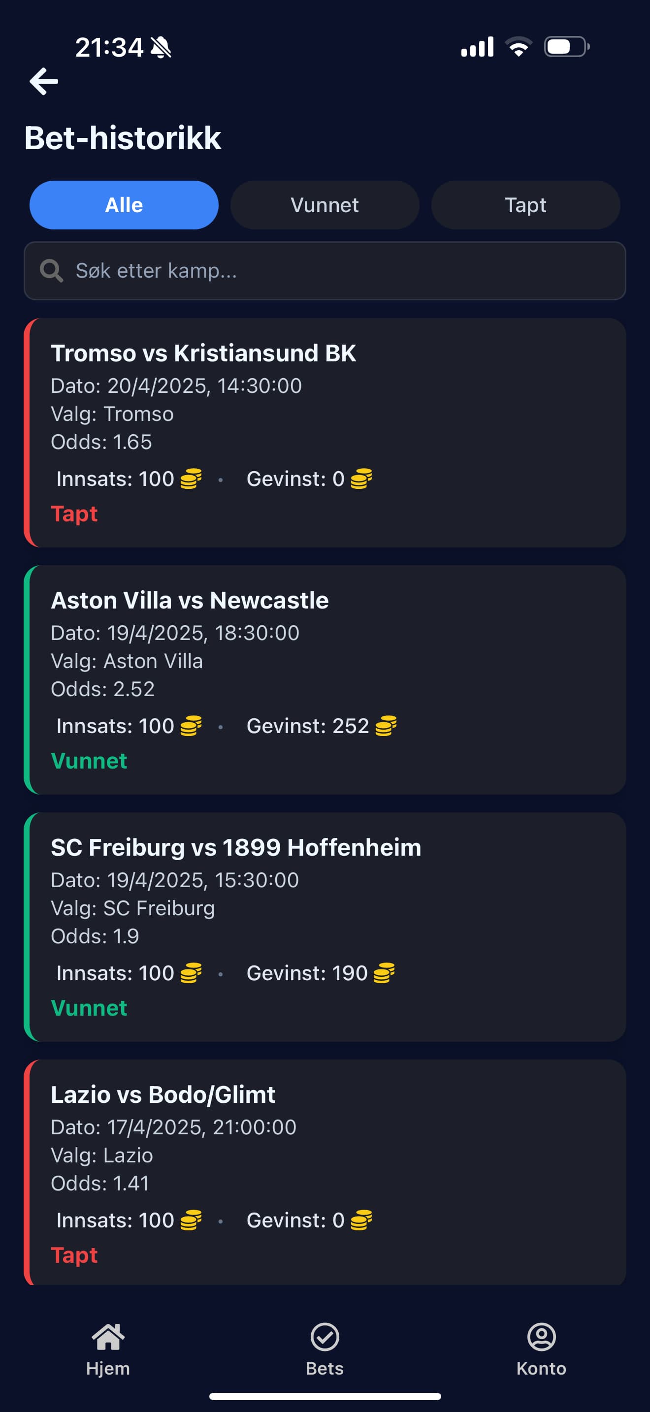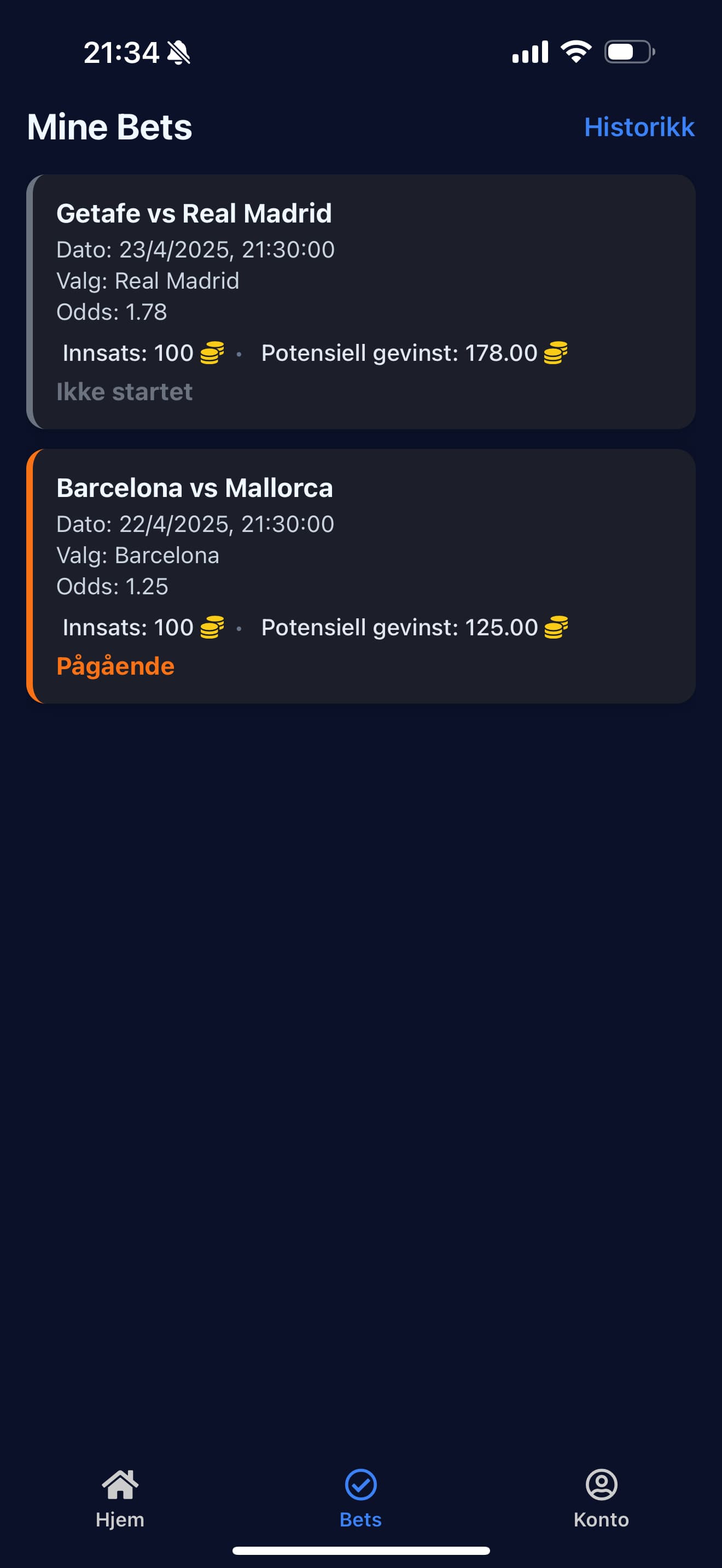 Mobilspill for sportsbetting basert på ekte fotballkamper, men uten bruk av ekte penger. Appen henter kamper og odds fra eksterne API-er og lar brukere plassere spill med virtuelle coins. Brukere mottar startbalanse ved registrering, kan følge åpne bets og får automatisk oppdatert saldo når kampene er ferdigspilt. Applikasjonen er bygget i React Native, og bruker Supabase til autentisering, database og backend-logikk. Det er også implementert frivillig kjøp av virtuelle coins via Stripe.