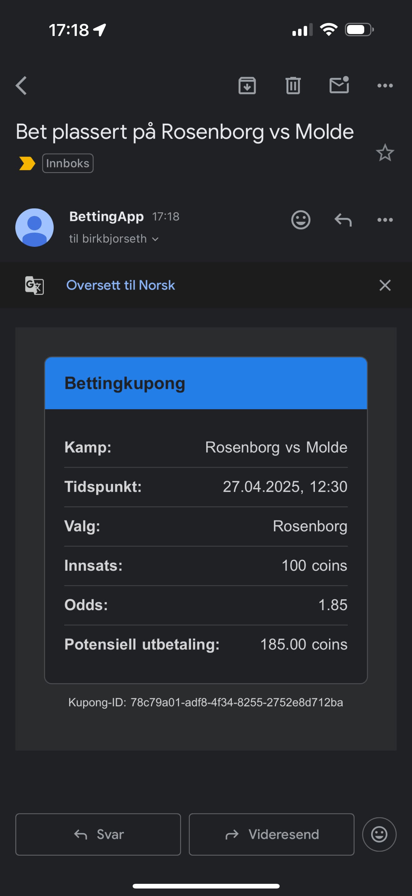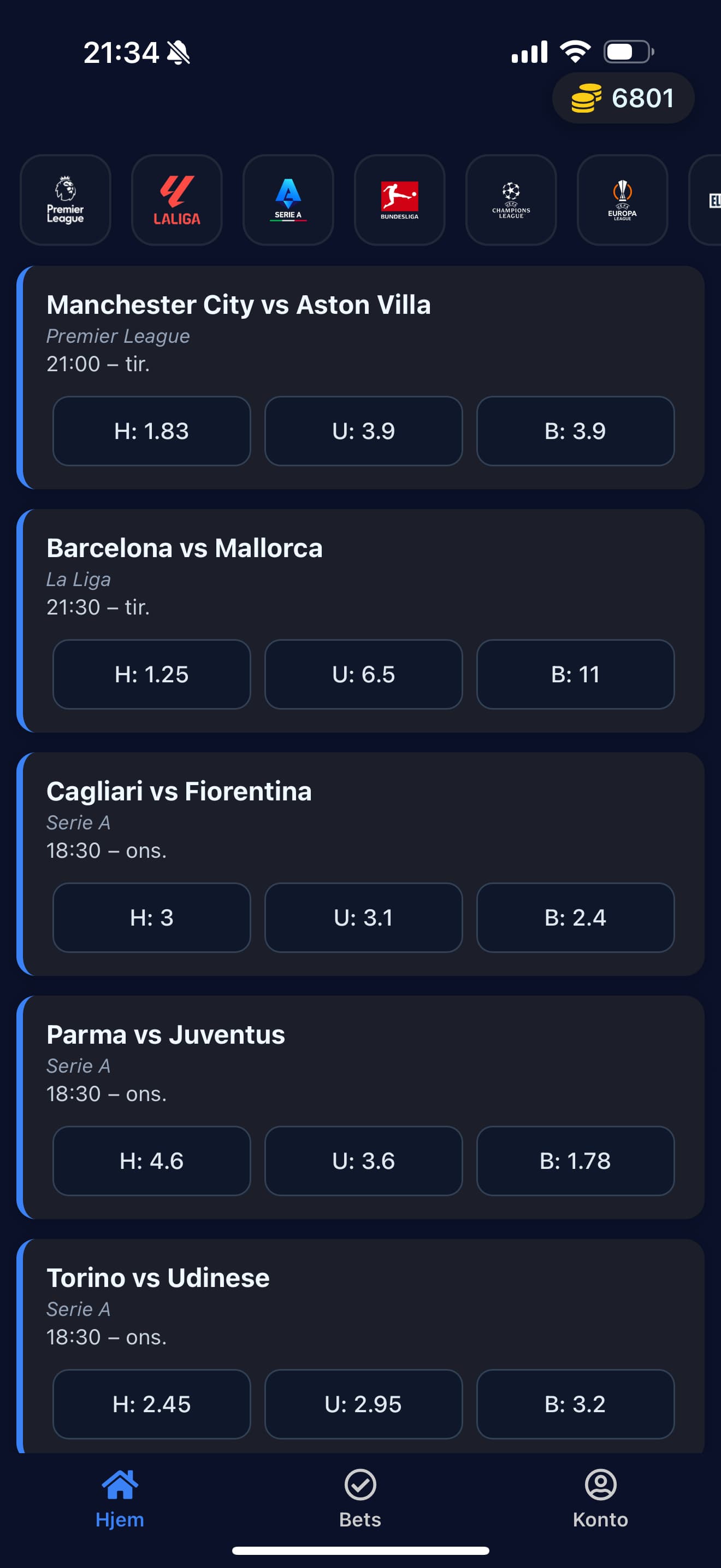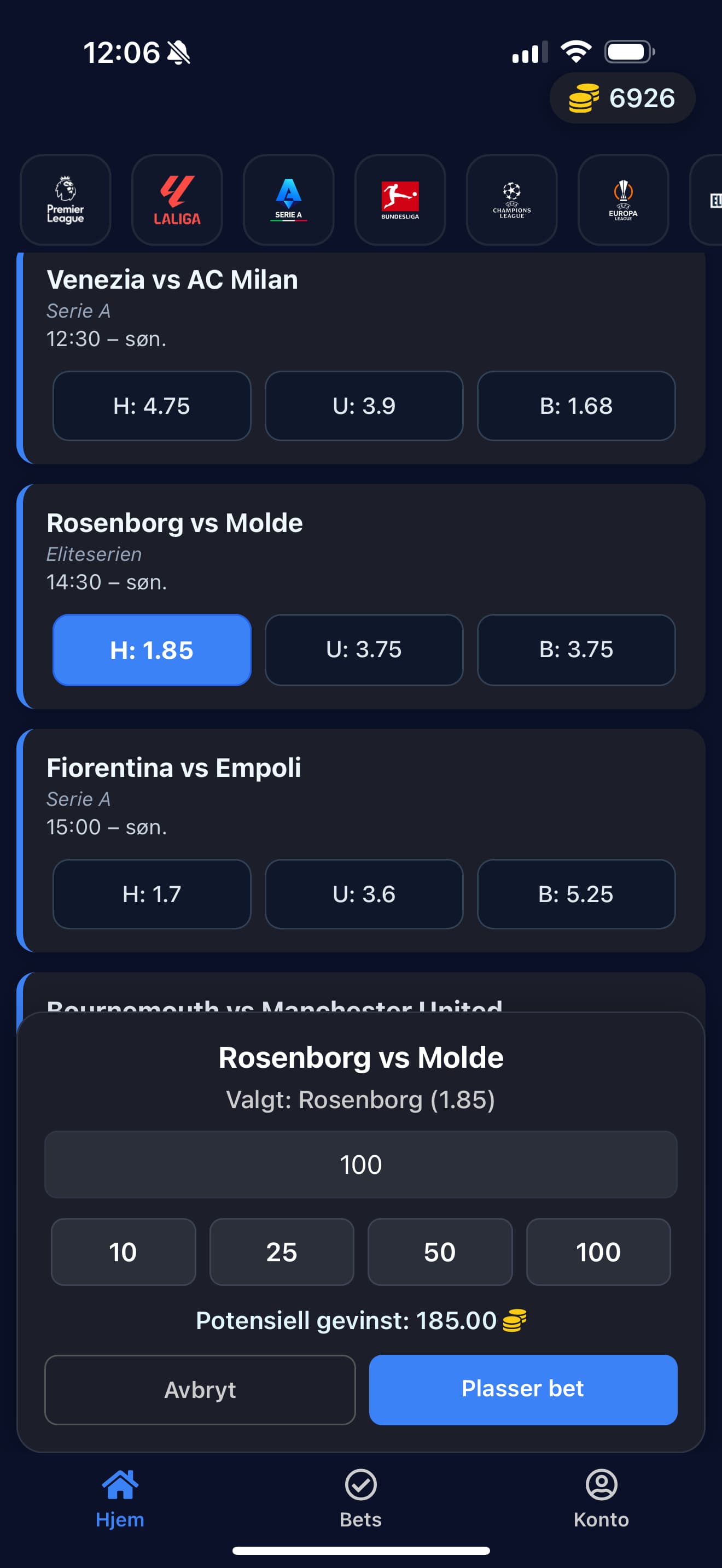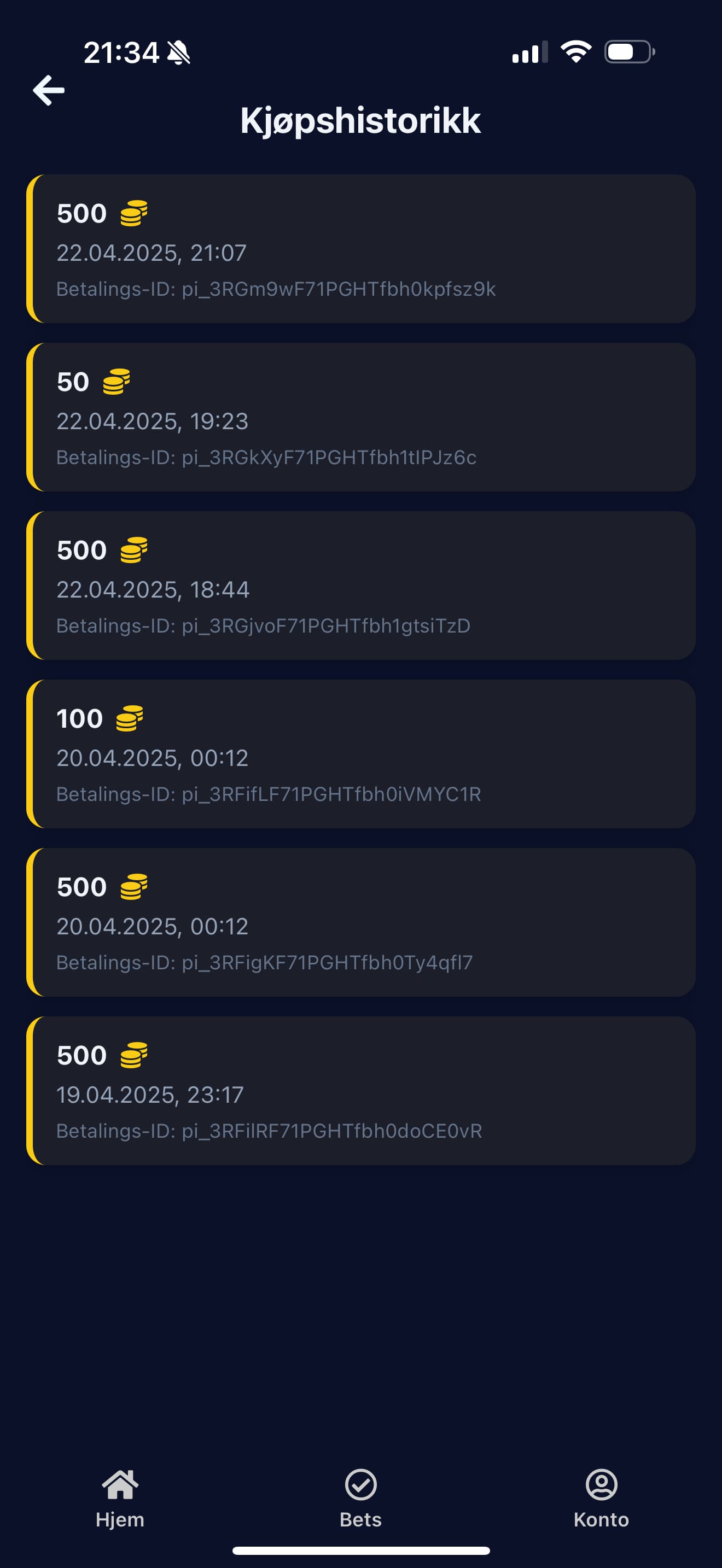 Mobilspill for sportsbetting basert på ekte fotballkamper, men uten bruk av ekte penger. Appen henter kamper og odds fra eksterne API-er og lar brukere plassere spill med virtuelle coins. Brukere mottar startbalanse ved registrering, kan følge åpne bets og får automatisk oppdatert saldo når kampene er ferdigspilt. Applikasjonen er bygget i React Native, og bruker Supabase til autentisering, database og backend-logikk. Det er også implementert frivillig kjøp av virtuelle coins via Stripe.